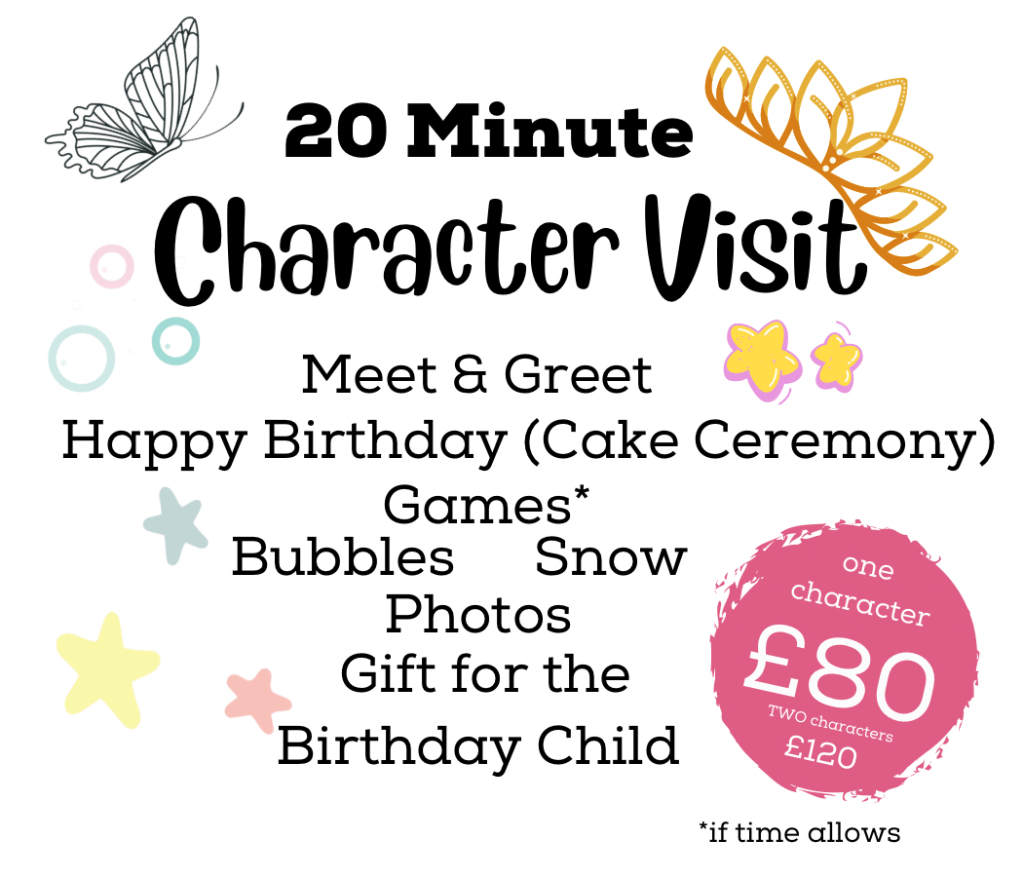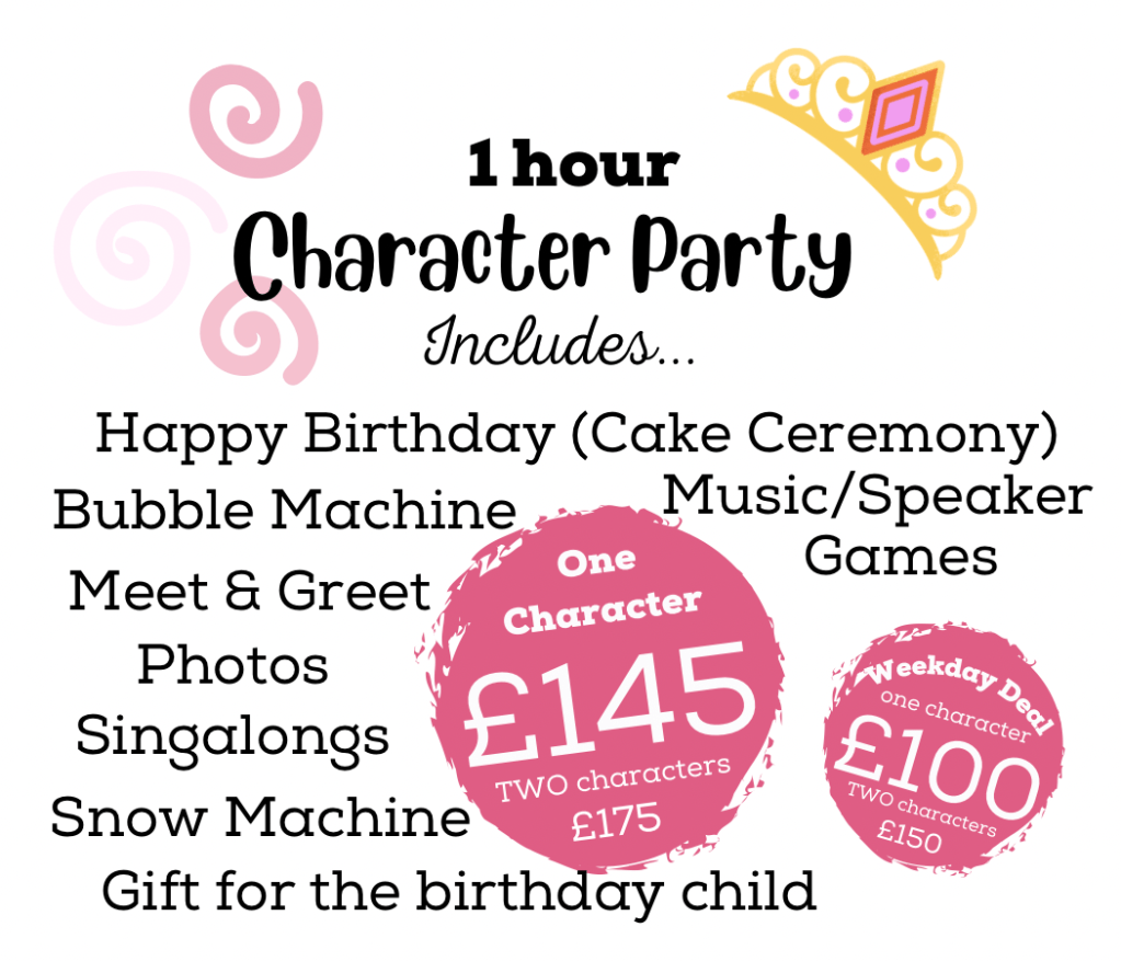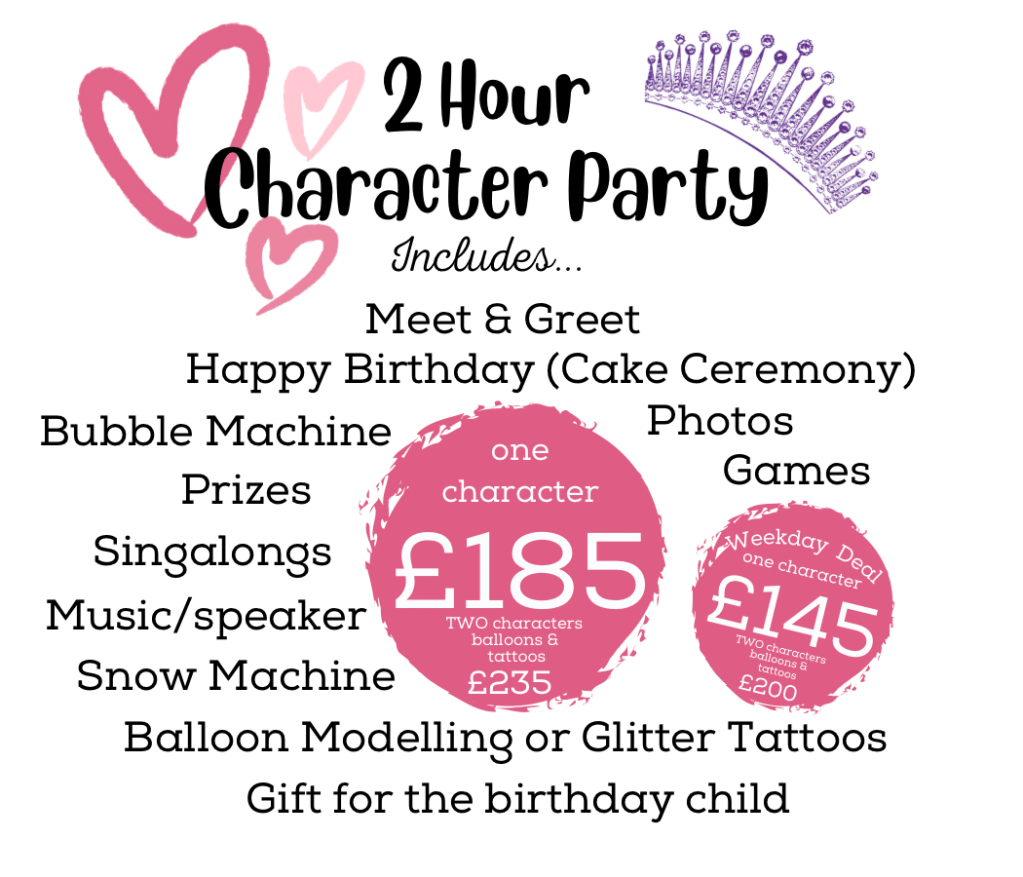Spider-Man parties require two staff members for logistical reasons. As Spider-Man cannot unload/set up or do glitter tattoos/balloon modelling in his suit, he cannot be in full costume for the 2 hours.
